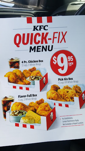 Read moreThe experience was based on several things KFC menu hasn't changed in awhile why is it that people have to see the menu to order the same two pieces combo they always get, than there's when I place my order and they give me something different, I asked for a wing fill up which is 4 portion wings they gave me two whole wings if I wanted whole wings I would have ordered whole wings so when I checked my order that's when they decided to tell me they didn't have portion wings and made it seems as it was my fault customer service is gone from...