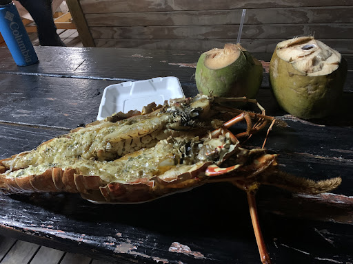The guy running it was grilling everything fresh over a wood fire — the smell alone was enough to draw us in. We ordered a huge Bahamian lobster and some shrimp, both incredibly fresh and cooked to perfection. Yes, we waited over an hour, but it was totally worth it. While we waited, he even gave us some beers on the house — such a chill, local vibe.