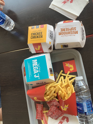 Подается бургер (курица - мясо - рыба) с разными вкусами (гриль, жареный и обычный), а также хот-доги, есть разные виды салатов, картофель, луковые кольца и кусочки курицы. Он также предлагает прекрасный список сэндвичей и кусочков пиццы, есть список сладостей и пирожных, а также напитков и свежевыжатых соков, кофе и чая, есть меню завтрака, которое содержит разновидности яичных бургеров с сыром и мясом, есть стоят столики на двоих или несколько человек, и есть санузел.