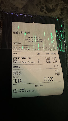 Read more"I recently had the pleasure of dining at Paradise Restaurant, and I must say, it was a wonderful experience! I ordered the Tandoori Chicken, which was cooked to perfection - the flavors were rich, the spices were well-balanced, and the chicken was tender and juicy. It was clear that the chef had put a lot of care into preparing this dish.