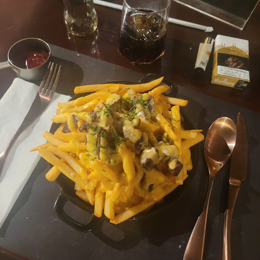 Read moreI have to say, what a very dissappointing experience! On arrival we sat on the terrace and were immediately greeted with "would you not rather sit inside" well no, or we would have gone inside? Next was what is your name and contact number? It felt like we were going to have to sign a contract to eat there...we had eaten here a year ago although the food was very pricey for fries and cheese it was fresh and home made, looked and tasted like a real putin should do. This time however all food was processed, very mediocre fries, 8 pieces of 1cm cube beef with fat and grissle and a drizzle of processed cheese sauce, they changed the waiter fortunately to a Kenyian which changed the atomesphere for the better. Took familly and mother in law for a last meal in Bahrain before flying home, but again sorry guys, if you are going to charge 5* or michelin prices for coloured buns, processed burger and the decoration we wish you good luck to fill your restaurant, will not go back and will certainly not recommend people to waste their money on this, go to Sha+×÷=/ Mama next door, half the price and a...