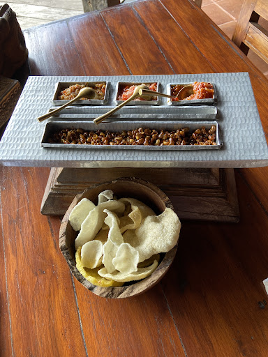I had the $165,000 rp meal which allowed me to choose from four different Balinese dishes. The starter is a selection of three different types of sambal with peanuts and crackers. I would never have though of eating those crackers and sambal together and not as a accompaniment to other dishes but it works on its own. The ginger and banana flower sambal was delicious and unique.