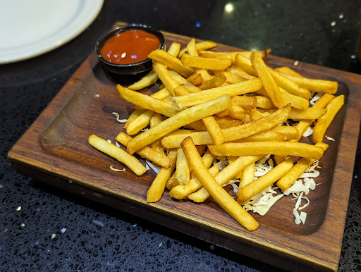We ordered Large french fries: The fries were good but a little burnt. Crispy chicken cashew nut salad: This item was the best. It was crispy and refreshing. We ordered twice. The portion size was less. Calamari fritters: This item tasted very good too. It was crispy and fresh. Chicken Pizza: This tasted really good. It was juicy and cheesy. The base was soft and crispy at the same time.. Loved it. Fish & Chips: It was very good. Perfectly fried. The fries were a bit over fried though. Apart from the fries it was a great filling dish. Seabass & Prawn: This dish was below average. Although the prawn tasted really good but the Salmon was tasteless & a bit smelly. With the help of a lot of lemon I ate it. The biggest disappointment was the mashed potato.. It was totally tasteless. It was totally bland. Even saying a few times about the mashed potatoes to the waiters they didn't show any interest. The sauteed vegetables were nicely cooked. 7: Grilled chicken with mushroom sauce: It was a good dish. The rice was perfectly cooked. The chicken was soft & juicy. It was a great dish. Totally filling for one person. Mashed Potato: As I said earlier. It was tasteless and bland. Totally disappointed. Lychee Iced tea: This was really good. Perfect combination of lychee flavor and tea. Blue Cassia: This drink came with a twist. When served this drink was a different color and after stirring the color changes to Navy Blue. This was the best drink.