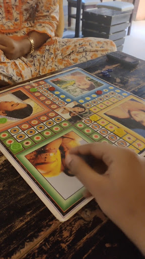 There are options for playing board games. Chess, Monopoly and Ludo boards are organized on a shelf along with some books.