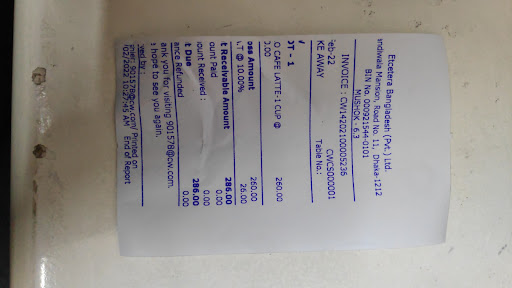 Read moreA coffee shop which is named Coffee World can’t be a place 6 feet by 6 feet. It has hardly 3 tables and 3-4 tools to sit on. That is such an injustice to the name. I have been to Coffee World Uttara ever since I have known a coffee shop. It is quite good, good ambience, food is also good. But this Banani outlet is a trash just because of the place they are using for the shop. You walk inside and see no place to sit. You feel embarrassed and irritated as you expected a hot cup of coffee and cookie and cake or frappe in a relaxing atmosphere. Most people will walk out on the shop experiencing this much, without even thinking of eating there or getting any sort of service from them. They need a...