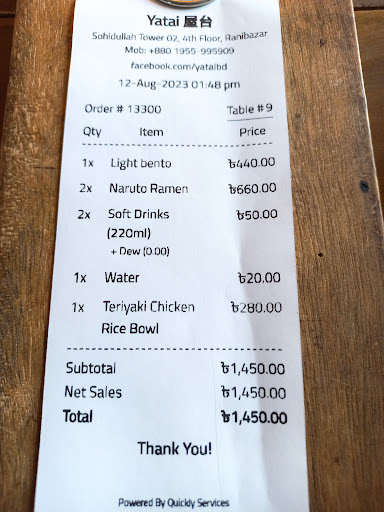 Read moreI went to the new location a few days ago and they absolutely deserve more hype! I've been to the old yatai couple times before, and I have to say, their interior and food have improved immensely. The interior is beautiful and the overview of the city at night gave a surreal experience from the top floor. We ordered a lot but it didn't take much time. We ordered their Tantanmen ramen, sizzling seafood platter and bbq chicken rice bowl. The Tantanmen ramen was a bit bland but rich and pairing with the sizzling seafood was immaculate. Sadly the potion of ramen has downsized but it had sides with it like fried chicken, which was great. The seafood was delicious, smoky and perfectly charred. The rice bowl was absolutely delicious though, the fried rice was really good, I haven't usually had fried rice this good in rajshahi. It was perfectly seasoned and topping it with the bbq chicken and vegetables were insane, got me craving for it again now. But I'd say the main stars of the dishes were the pancakes and matchamisu, the desserts! The pancakes live up to the hype, they were deliciously sweet and airy with the cream, might be too sweet for some people, but was perfect for me. The matchamisu was a literal dream, perfectly sweet and the mascarpone gave it a delicate and sweet crunch, the matcha also paired really well with it. Sadly the brownie wasn't available. I also loved their mint lemonade drink, but the pineapple chiller drink was pretty underwhelming. They have higher price point but as it's a fine dining restaurant, I think it was pretty worth it. It's perfect for date nights, dinner dates, family dinners or a night out with friends on a splurge. Their staffs were kind of inexperienced at first but very kind and polite and gave great service. Only issue we faced was the location, they didn't put a sign outside yet, so it took a long while to find it. Other than this, I'll...