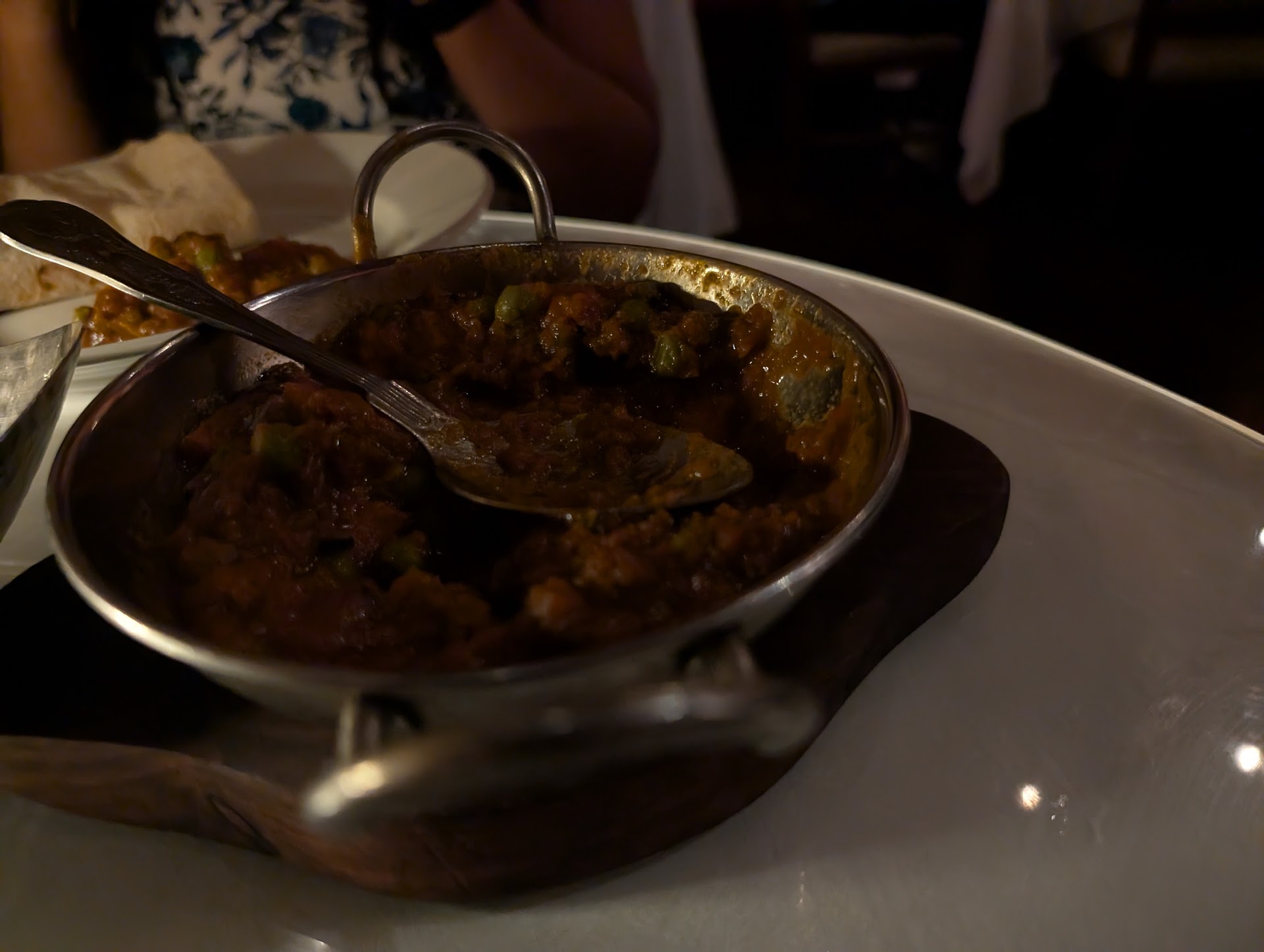 When the appetisers arrived, they did not look the best. My lamb samosas were incredibly oily and lacked flavour. I don't think they were freshly made. The Onion bhaji ordered by my partner were also very oily and burnt. At this point were so hungry we ate what was served. The mains appeared better. We spoke with another member of staff who confirmed that my partners food was vegan. My chicken madras tasted OK. The garlic naan looked under cooked and still had a doughy texture. I could not finish it.