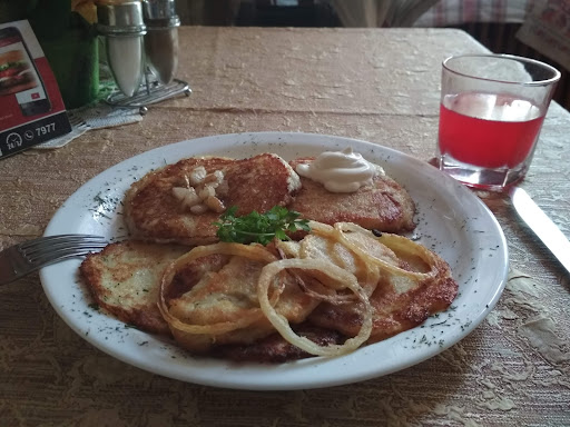 Покушать нам здесь не удалось. Внимательно изучила меню, для меня все блюда были жирными нажористыми, ничего выбрать так и не смогла. Из супа борщ, солянка, фляки с бобами и холодник. Люблю крем супы с грибами или сырные или овощные, ничего такого для меня нет. Так же люблю горячие салаты для меня как основное блюдо, в меню реально много салатов написано, большинство с майонезом, пара с соевым соусом, один с кетчупом, в некоторых указано салат заправка, но не написано слово тёплый салат, а это значит что либо они все холодные, либо надо это уточнять у официанта, что не очень-то удобно. Блюдо нам давали на беларусском языке, мне было многое непонятно, приходилось додумывать логически и уточнять у мужа. При входе к нам сразу подошёл (думаю хозяин) дал меню показал рукой на стол куда сесть, не проводил, не улыбнулся приветливо. Вроде и встретили, и меню выдали, но почему-то то я гостеприимства не ощутила, а холодок и не заинтересованность. В ресторане в тот момент сидела большая компания из 8-10 человек. Были резервы на два три стола. Возможно хозяин (ну или не хозяин, тот втречающий человек) был в запаре и торопился, хотя не считаю что 8-10 человек это аврал. Можно уделять больше внимания каждому гостю своего заведения, возможно подойти, порекомендовать ему что-то, если видишь что человек 10 - 15 минут сидит с потерянным лицом в меню). Количество посадочных мест примерно 50 как мне показалось, заведение небольшое (15 столов примерно). Атмосферное, в стиле национального быта, за это пару звёзд поставлю. Больше ничего не понравилось, ни меню ни отношение к клиенту. Вкус блюд оценить не могу, пробуйте друзья, оценивайте. Надеюсь информация кому-то будет полезна. Приятного...