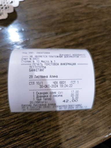 Read moreЗаходил на ужин. Из-за какого-то мероприятия был полный зал, поэтому пришлось занять место на диване с низким столом. Заказывал скандинавский сливочный суп, драники с лисичками, травяной чай. Блюда ждал около 40 минут. Первым принесли суп. Он оказался в виде пюре. Внутри пара кусочков лосося. Вкусно. Далее подали 4 достаточно больших хрустящих драника с доброй порцией лисичек в сметане (на фото уже перемешано, изначально всё лежало отдельно). Сочетание хорошее, понравилось. Обслуживание не очень внимательное. Не принесли салфетки. Общий чек...