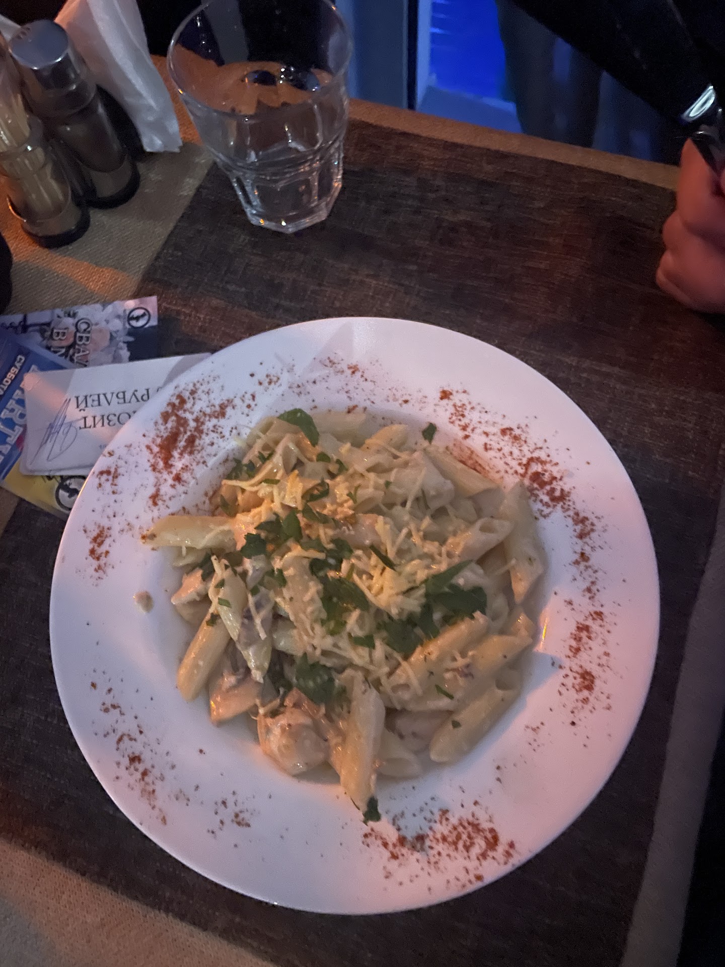 Read moreПри первом впечатлении это хорошее место где можно поговорить или что то отпраздновать на террасе 2 этаже открывается прекрасный вид на реку Сож столики чистые столовые приборы тоже но соль немного отсырела меню бумажное не обтянуто кожей или чем-то ещё немного неудобно и бумага не защищена от воды плёнкой в самом меню нету коктейлей без алкоголя либо я просто не нашёл хотя оскал я долго в основном с добавлением алкоголя те что я пробовал и без него в других заведениях в основном меню нормальное пару салатов, мясных блюд, блюд из птицы, немного десертов но с разными добавками ну и алкоголь, алко коктейли, и по мелочи хлеб и закуски, официант при заказе не уточнил заказываем мы 1л сока и принёс 200 мл потом мы уточнили и он принёс 1л и потом стаканы. По еде: Еды в меню много но мы заказали сок 1л крем-суп тыква, паста с грибами и курицей с соусом и сыром, и рулеты из курицы, принесли нам сок через 5 минут но 200мл потом через ещё 5-7 1л и через ещё 15 минут суп и пасту, ещё через 3-5 мин рулеты, первым попробовали сок ну и сок как сок ничего обычного стоил он 6р литр потом пасту и паста было отличной с сыром на верху довольно вкусное порция хорошая наелся и дал попробовать 200-230гр стоит 10 руб но купил бы за 6-7 подача хорошая с каплями кислого соуса по краям. Суп-крем из тыквы за 3.75 р мне такое не нравится но по словам того кто ел очень вкусный нежный суп но есть и лучше. Рулеты из курицы когда официант принес рулеты мы попробовали и либо это очень жёсткая курица либо это свинина но для свинины довольно неплохо с перцем и соусом но сам факт того что перепутали не очень радует цена 9.60 р после мы попросили счёт и нам его принесли в маленьком сундучке счёт вышел в 31.70 + чаевые в основном заведение хорошее но я бы больше не пришёл из-за отсутствия блюд которые мне по душе но судить вам всё меню есть в интернете ставлю этому заведению 3.5 но в...