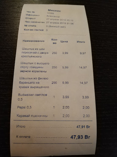 Read moreК моему большому сожалению, не единожды сменился персонал и меню указанного заведения, что негативно сказалось на качестве обслуживания клиентов. Около 2-3 месяцев назад, приходил в Мясник с друзьями, расказывая о том, какие положительные эмоции испытал при первых посещениях. Однако, возвращаясь к событиях 2-3 месячной давности, мы прийдя в Мясникъ были удивлены тем, что из алкогоьной продукции (водка) была только одна позиция и та Немиров, горячие закуски также не были представлены так, как было заявлено в меню. Из соков также было 2-3 позиции, которые нам не понравились. Не было ни яблочного вкуса ни апельсинового. Заказ сок собственного производства, мы были удивлены примитивностью его приготовления и твоатитеььным качеством. Кстати, посещая Мясникъ 5 октября 2020 года, качество водки осталось прежним. Все тотже Немиров и ему подобные напитки. Нет ни бульбаша, ни сваяка, ни Кристалла. В этой связи мы снова ушли из заведения ничего не заказав. Особое внимание заслуживает и персонал заведения. Была девушка полного телосложения с крашеными белыми волосами. Очень не педантичный человек, никакого внимания и заинтересованности не проявила. При этом приняв заказ пошла курить, на 40 минут. В общем агонь. Поэтому вынужден констатировать, что...