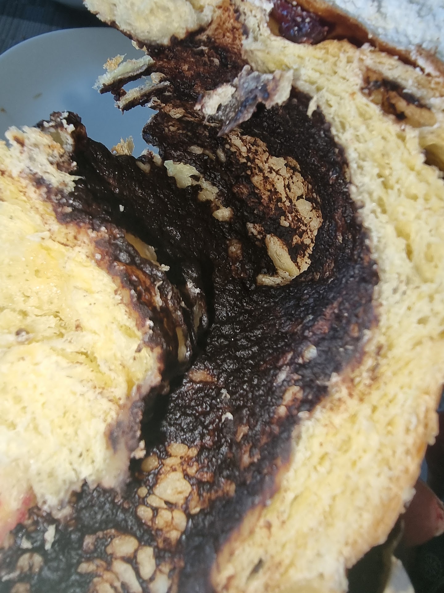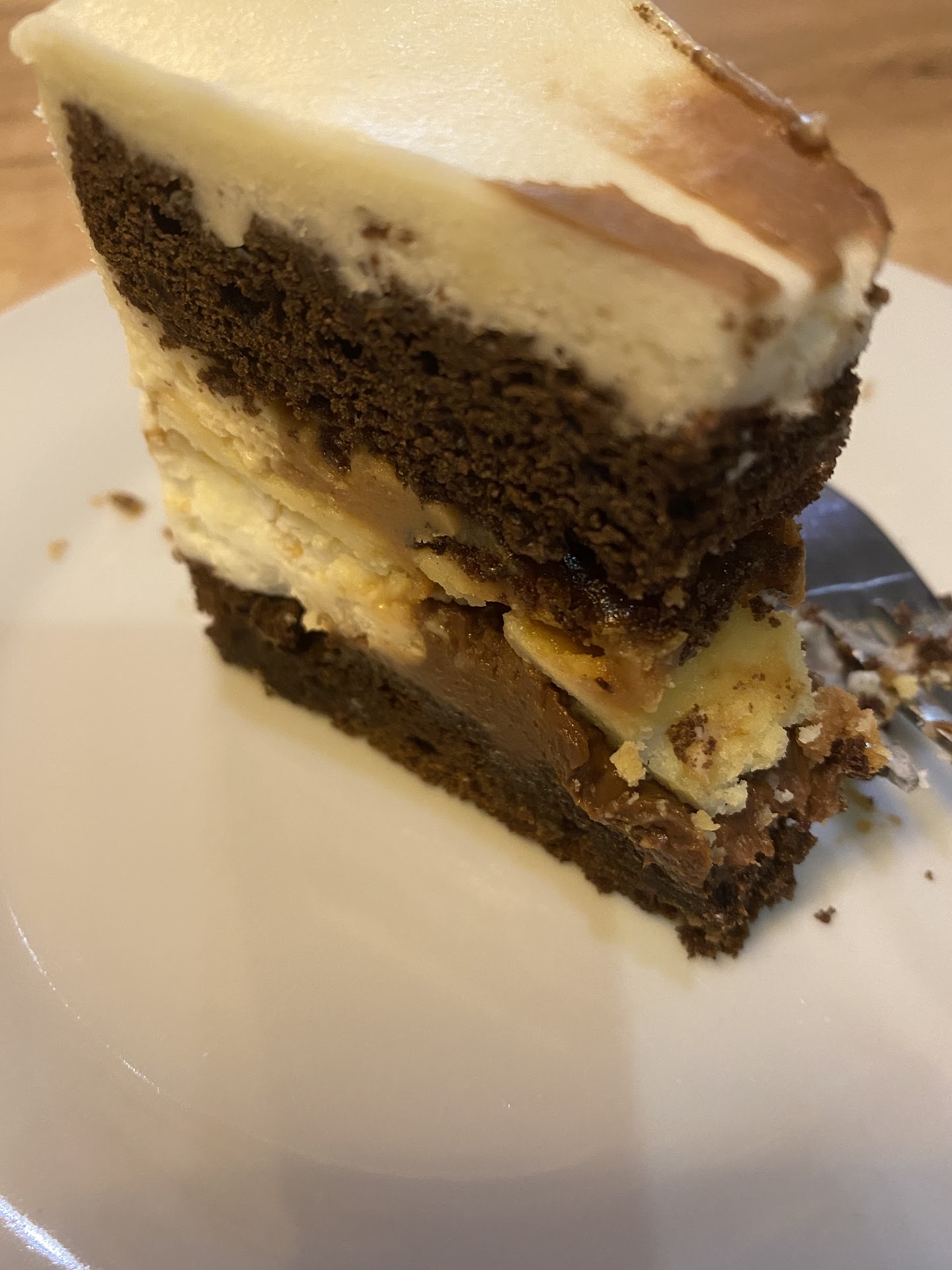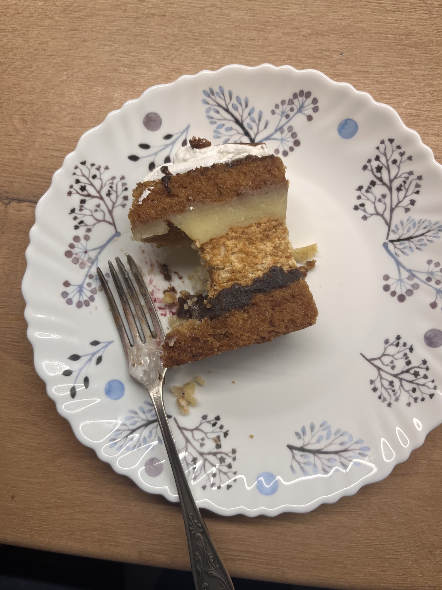 Сегодня зашли за десертами. Один - груша дорблю - все ок, второй - в теории халвичный (на фото) - по факту черствый ужасно и там есть все, кроме халвы: смородина, шоколад, белый крем, два вида коржей, белковый крем. Как будто положили все, что есть.