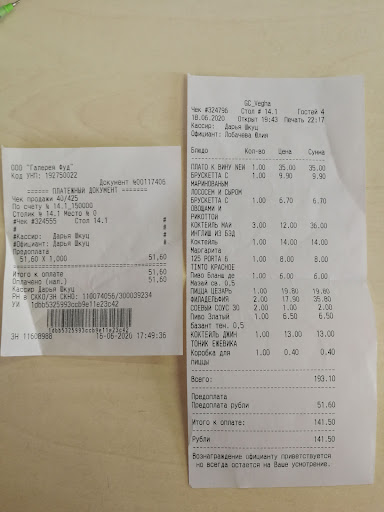 Я отмечала в данном заведении свой день рождения 18.06.2020. За два дня я забронировала столик на 4х человек на 19:00 и сделала небольшой предзаказ, т.к. была наслышана о длительном ожидании блюд. Администратор Дарья приняла заказ. Я внесла предоплату, сообщила о том, что у меня будет день рождения. Администратор предупредила о том, что нужно взять паспорт и попрощалась со мной, но я вовремя вспомнила про чек и попросила его пробить. Администратор нехотя, с вопросом "Какой нужен чек" пошла его пробивать. В намеченный день наша компания немного задерживалась, но из кафе даже не позвонили. Я позвонила сама спустя 30 минут опоздания и предупредила об опоздании. Мне повезло, что я заказала закуски, а не горячие блюда, которые за 30-40 минут остыли бы. По прибытию в кафе я подошла к администратору и сообщила о том, что мы приехали. Через несколько минут нам принесли меню. От того, что происходило потом, я была в шоке: В блюде плато к вину заменили виноград на апельсин (никто об этом не предупредил) и на вопрос "почему была сделана замена" я получила ответ, что "вероятно виноград закончился". Для меня остается загадкой, как продукт мог закончиться, если я оставляла предзаказ за два дня. Официант Юлия подходила к столику очень редко. Для того, чтобы заказать еще несколько блюд пришлось остановить официанта Влада, который, по счастливой случайности, проходил мимо нашего столика. С праздником меня никто так и не поздравил! Около 21:30 я напомнила официанту о том, что у меня день рождения. Подошла администратор Дарья и попросила паспорт, чтобы его сфотографировать. После отказа делать фотографию моего паспорта Дарья ответила "Ну и ладно", развернулась и ушла. Я попросила чек и положить два кусочка пиццы с собой. Два небольших кусочка пиццы нам положили в ОГРОМНУЮ коробку из-под пиццы. Стоимость коробки также включили в чек. Естественно впечатление было испорчено и ни о каких чаевых речи не шло. Я рассчиталась по счету без сдачи и мы ушли. На улице меня остановила официант Юлия и сказала, что я не доплатила 51 руб. Мне пришлось вернуться в кафе и ждать несколько минут, пока персонал разбирается с тем, что у меня предоплата (в чеке указана сумма предоплаты и прописана сумма к оплате). Никто передо мной даже не извинился за это недоразумение.