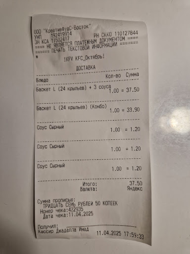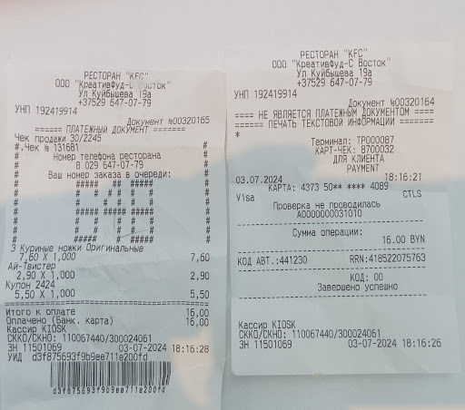 Давольно часто посещаем именно этот kfc, так как близко к работе и дому. Всегда было все отлично! Но сегодня была просто катастрофа какая-то. К слову, я человек очень лояльный иине придирчивый,который обожает? (ал) крылышки kfc. Сегодня: все началось с отсутвующей ленты в терминале самообслуживания (ну, бывает, это не критично), потом нам забыли положить в заказ колу и соус (ну, тоже бывает, когда загруженность большая, но на зале пару столиков, да и еще эпидемия, очередей нет), картофель фри - это не картошечка солёная, а СОЛЬ КАРТОФЕЛЬНАЯ, и мои любимые крылышки... В них столько перца!!! Вот оно не то, что от души, а душевно в душу вагон и маленькая тележка. У супруга ай-твистер развалился в руках, а чизбургер так же оказался не вкусным из-за чрезмерно острой панировки. Что может быть хуже? На линии раздачи (касс) ОЧЕНЬ громко и эмоционально разговаривал парень, который периодически использовал нецензурные лексику ( все мы не без греха, но нужно понимать, что Вы не дома), до кучи за соседним столиком сидела сотрудница (менеджер, я предполагаю), у которой назойливо на весь зал звонил телефон и пока люди не начали кидать свои раздраженные взоры онамнн посчитала нужным ответить или сбросить звонок. Друзья, помните, что выйдя с работы вы так же становитесь потребителями, в магазинах, барах и так далее, и вам тоже важно, чтобы все было комфортно, ведь Вы несете свои честно заработанные деньги тратить на лучшее. Подумайте о том, какой Вы создаёте комфорт для...