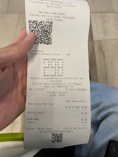 Read moreПервый и последний раз были в этом кфс. Очень смешно , когда висит большое табло с рекламой «Съешь горячий бургер» , а получаешь холодный) хотя мы просили горячий) окей, потом заказываем ведро крылышек и стрипсы, и просим опять горячие , что готовы подождать сколько нужно, нам выдают опять всё холодное и дубовое , можно бить этими стрипсами об стол . И когда просишь книгу жалоб , менеджер говорит , что соврали , что они только что приготовленные , а лежали уже точно пол часа ) ну комон, ребята , неужели так тяжело людям , которые приходят с запросом на горячую еду дать ее) а остальным , кому не важно это , отдавайте дубовые стрипсы Берите пример и уроки с кфс Сурганова , там...