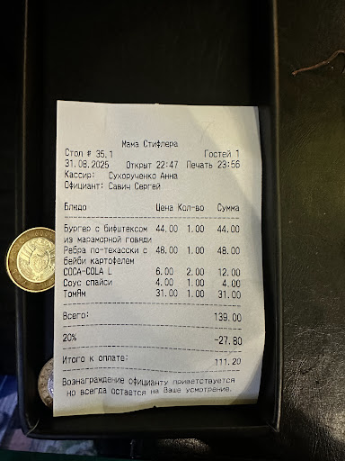Настоятельно рекомендую обходить этот бар-клуб стороной, тк в нем разводят на деньги. Такого позора перед гостями из-за рубежа я давно не испытывал. Отдыхали компанией 4 человека (2 парня и 2 девушки) в выходной день. Я показывал гостям Минск и в частности решил показать улицу Зыбицкую ночью. Зашли в "Маму стифлера". На баре решаем заказать алкоголь. Выбираем алкоголь за минимальную сумму (рублей 15 или даже меньше) и вишневый сок (7 рублей). При этом трижды и очень громко спросили, что сколько стоит. Бармен называет цену, но потом уточняет, что данного вида выпивки нет, но есть другой вид очень похожий. Я говорю ок. Потом он приносит мне счет на 37 рублей (аналогичная выпивка, как оказалось, стоила уже 30 рублей). Самое интересное, что счет нам принесли после того, как мы начали пить, чтобы невозможно было отказаться от оплаты. На вопрос "что за ерунда" бармен начал кричать, что мол он предупредил, что нужной нам выпивки не было. При этом он назвал и не уточнил цену заранее и счет принес только когда мы начали пить, спустя минут 5. Рядом со мной была девушка и ругаться особо ни с кем не хотелось, чем воспользовался нечестный работник данного заведения.