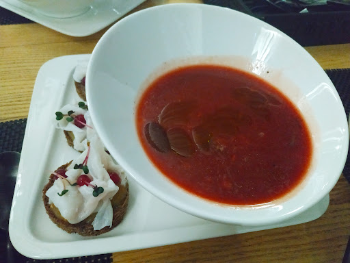 Решили попробовать сет республиканского гастрофеста, выбор пал на сет данного заведения. Как следовало из описания, сет представляет лучшие традиции греческой кухни с элементами современной кулинарии. Брали навынос. Пришли к самому открытию, но все столики уже забронировали. Заказали сет, а подождать нам предложили в мягких креслах у ресепшена. Ждали минут 20. Добрались до дома и начали пробовать. На закуску был сет тартаров: из говядины, из семки, из сельди с яблоком, из копченой свеклы и из груши с риккотой. Все тартары были на подушке из крошки бородинского хлеба. Мой фаворит- тартар из груши и риккоты, с говядиной на втором месте. Дальше был салат из томатов, огурцов и сладкого перца с заправкой в виде креветочного масла. К салату шли греческие лепешки с муссом из Сиртаки с грибами. Лепешки мы не поняли, слишком жёсткие, но намазка вкусная. Овощи в салате вкусные. Многовато масла, по мне. На основное блюдо был кускус со сливочно-лаймовым соусом, желтоперый тунец и тигровая креветка в сухарях. Это блюдо зашло на ура. Слегка обжаренный сочный тунец. Креветка в хрустящей панировке, упругая и сочная внутри. Сливочно-лаймовый соус очень хорошо это все дополнял в сочетании с кускусом. Мягкий сливочный вкус с освежающими нотками лайма на 5+. На десерт: хрустящие Катаифи с грецким орехом с медом и желе из маракуйи в вафельных сотах. Катаифи мне не очень понравился, по мне, слишком твердый был сверху. Но на вкус хорошо, чем-то на турецкую пахлаву похоже. А вот желе очень понравилось, кисло, сладко, очень фруктовое и все в мягких сотах. Очень хорошо. Однозначно стоит попробовать сет, пока гастрофест...