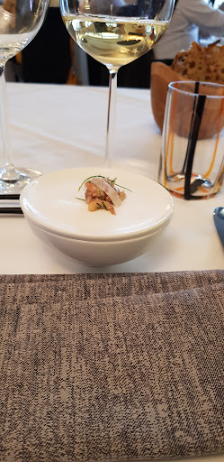 A part les quantités dans l'assiette, rien ne m'a fait penser que j'étais dans un restaurant étoilé. Nous avons pris le menu du marché. L'entrée était bonne, sans plus. Le plat sans goût. Poisson fade, sauce fade, accompagnement fade. Nous avons reçu très peu de mises en bouche (2) par rapport au même menu dans d'autres restaurants du même type. Le sucré a un peu relevé le niveau. Le moelleux au caramel au beurre salé était très bon mais -bien que personnellement cela ne me gêne pas du tout- je n'ai pas identifié la moindre touche de sel. Quant au carpaccio d'ananas, biscuit, glace au rhum, c'était une glace rhum raisins et le biscuit n'en était pas un puisqu'il s'agissait d'un truc tout mou sur lequel était posée la boule de glace. J'ai apprécié le fait de pouvoir choisir le dessert à la carte, par contre pourquoi proposer deux plats mais une seule entrée ? N'aimant pas le pigeonneau également proposé en plat, nous nous retrouvons obligés de prendre du poisson en entrée comme en plat. Soit le menu est totalement imposé (et équilibré), soit deux choix doivent être proposés en entrée comme en plat. Bref, grosse déception après tout le bien que j'ai entendu de cet...