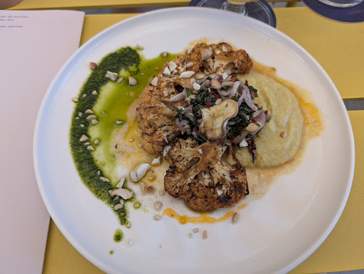 Minder positief: Ik had de vegetarische suggestie: bloemkoolsteak met zoete aardappelen. Het was lekker en het kostte 22€. Ik vind dat veel geld voor een stuk gegrilde bloemkool met een currysausje en wat huisgemaakte pesto. Ik had ook een glas Belgische rode wijn uit Dinant genomen. Die wijn was echt onwaarschijnlijk lekker. Prijs: 9,5€. Ons glas was echter slechts voor een kwart gevuld. Voor die prijs verwacht ik een deftig gevuld glas. op de website staat wel de menukaart, maar...