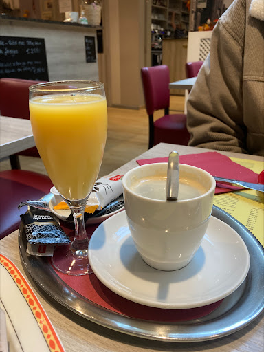 's Morgens een simpel ontbijtje besteld. Er werd een surplusje gevraagd voor pistolets in plaats van brood wat we uiteraard niet zo erg vonden. Je kon kiezen tussen kaas en/of hesp. Je kreeg ook confituur en choco erbij. Ik had wel graag nog een extra schelletje kaas of hesp gelust, maar het heeft zeker en vast gesmaakt. Als drank kreeg je fruitsap en thee of koffie. De zaak zat snel vol en dat zegt genoeg. Hier zullen we nog wel...