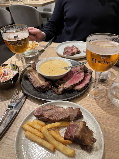We decided to share the rib eye (Irish on the bone) which came with salad and fries. They asked how we wanted it cooked (medium rare) and that is exactly how it came to the table, the salad was as you’d expect in any brasserie in France or Belgium as were the fries. The meat was delicious and flavourful and everything we wanted. We had 4 beers in total with it , and were delighted to see the local Maredsous Blonde on tap at a very reasonable price of €5. I had dessert and coffee as well, and altogether it came to €114 which I personally feel is what you should expect to pay for that cut of beef, dessert and drinks. I really do recommend this place as someone who has travelled extensively and dined in restaurants, Brasseries and less formal eateries...