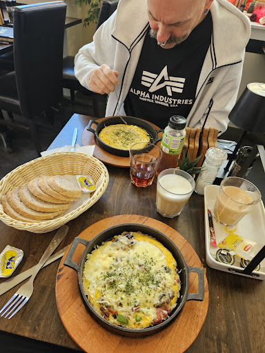 Un'intensa giornata di visita non può che iniziare con la giusta dose d'energia 💪🏻, anche in quel di Anversa; proprio per questo, durante la nostra passeggiata 🚶🏻🚶🏻♀️ verso il centro abbiamo scelto di fermarci presso questo locale per un abbondante brunch. Giunti al Bakkerij Diné sulle 12.45, abbiamo dato subito un'occhiata 👀 sia al listino 📋 che al bancone optando, quindi, per un uovo all'occhio di bue 🍳 su base di pane da toast 🍞 con insalata mista 🥗 come contorno, un menu colazione (comprensivo di prosciutto/formaggio, pane 🍞, cornetto 🥐, confetture/nutella/rochefort e cappuccino), cinnamon roll, gaufre 🧇 (formato rettangolare, ovvero la variante di Bruxelles) con nutella, due spremute d'arancia 🍊 e un caffè ☕️. Nonostante le condizioni meteo non fossero idilliache ☁️ (infatti è poi iniziata una fastidiosa pioggerellina 🌧) ci siamo accomodati all'aperto sotto i gazebo. In breve la gentile responsabile 👩🏻🦰 ci ha servito il tutto direttamente al tavolo con nostra grande soddisfazione 👌🏻. Valido il rapporto qualità/prezzo in virtù dei 37,60 euro 💶 totali del conto, saldati al bancone tramite POS 💳. Bagno 🚾 pulito e in ordine 🚽🧻🧴. Sulle 14.00, infine, abbiamo ripreso la nostra passeggiata 🚶🏻🚶🏻♀️ esplorativa del centro città. In chiusura, mi si consenta una considerazione sulla bandiera arcobaleno 🏳️🌈 appesa sotto il gazebo (vedasi foto 📸 allegate 📎), la quale celebrava il Pride organizzato in città proprio quello stesso fine settimana. Fatta salva la facoltà di ognuno di esprimere idee e posizioni, mi domando perché, tra le molte bandiere che si sarebbero potute esporre, la scelta sia ricaduta proprio su quella in oggetto. A me, ad esempio, sarebbe venuto spontaneo pensare a quella palestinese 🇵🇸, soprattutto alla luce di quel che sta accadendo anche in questo preciso istante sulla striscia di Gaza ma, del resto, vi sono priorità e priorità. A parte ciò, il locale c'è piaciuto ergo LO...