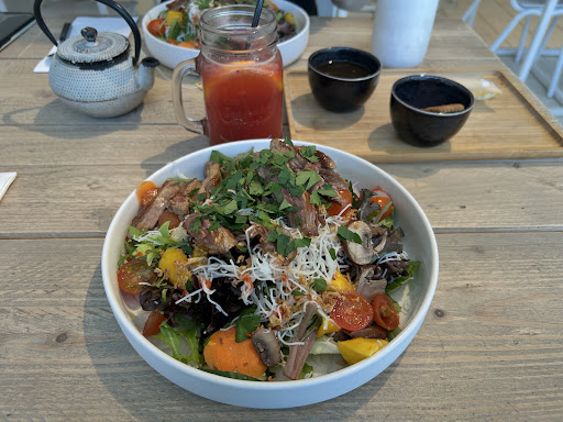 We ordered a homemade lemonade and a tea — the lemonade was actually very good. For lunch, we both went for the Thai salad. It was a bit strange to find mushrooms in it, and the taste didn’t really work well with the rest of the salad. It also seemed like the salad came from a prepackaged mix — we even had a few soggy, dark leaves that clearly shouldn’t have been served.