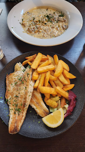 We ordered: Sea bass, which came with fries and 2 pieces of lettuce (€32). The mayonnaise we asked for in addition to the fries came in a supermarket bottle and not in a plate(as one might expect in a fancy restaurant). Mushroom ravioli (4 huge pieces on a plate) (€23). Tiramisu dessert was average(€10). Double whipped cream (100 cc glass) excessively sweet, with sugar that didn't melt completely (€2).