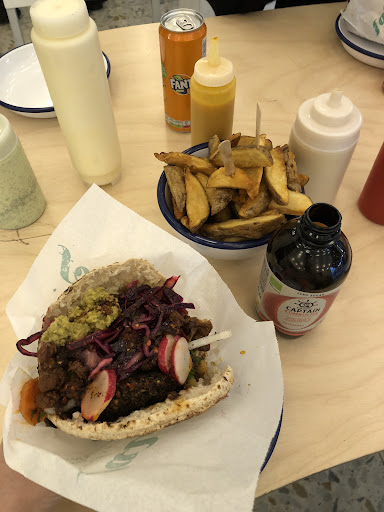 Read moreFalafel Tof is everything you want in a falafel shop: modern, clean, delicious, and inexpensive! As of 08.12.2018, you can get a falafel sandwich, drink, and potato wedges for 9,90 (yes, potato wedges, not fries - and they're better!). As such, this place is busy at almost any time of day so it's good to know what to expect. You order at the register. If you order the sandwich, you'll be asked to take a seat and someone will notify you when you can come up to put your own toppings on. This salad bar is SO GOOD! The staff will bring you four delicious sauces: tahini, mayo, mango, and garlic & dill sauce, all of which are awesome. When you're done eating, you pay at the register. Beware though, the owner will remember you and any past sins (like having a husband that doesn't order anything but a drink and then proceeds to eat your fries!!)! If you're lucky and are eating there at closing time, the owner will invite you to take another pass at the salad bar. Do better than me and just play it cool. ;) Be sure to try the pickles and...