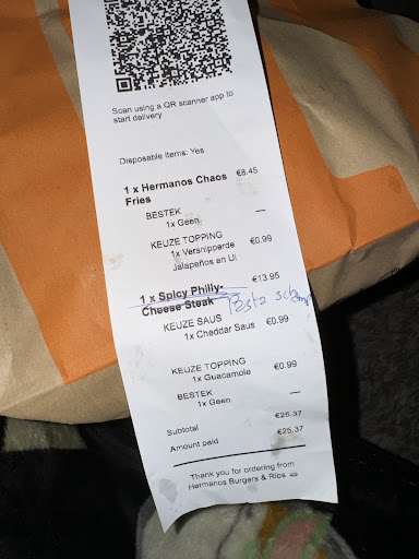 Na verschillende keren te horen gekregen hebben ‘yo boys jullie eten is zo klaar’ werd het eten en de cola na 50 min geserveerd. Met een vlug excuus er is veel besteld via de app moesten we zelfs op ons drankje 50 min wachten.