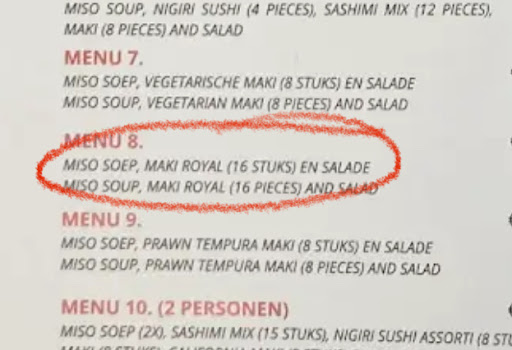 I had a very disappointing experience at this sushi restaurant, and I would not recommend it to anyone. I ordered a set from the menu, which included miso soup, maki royal, and a salad. The menu clearly stated that the set included 16 pieces of maki, labeled only as “maki royal,” with no additional information about the ingredients.