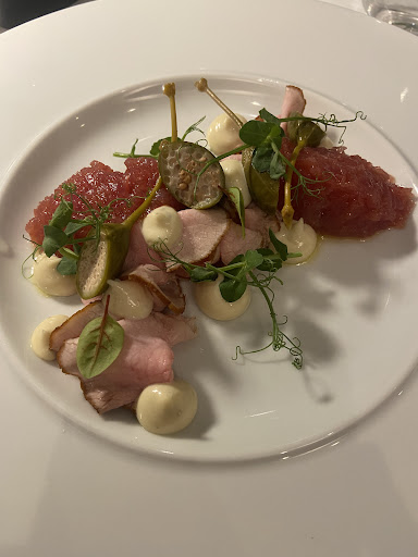 De eerste gang, 'Frisona', betoverde met een tartaar van Frisona-rund, subtiel gecombineerd met romige geitenkaas. De harmonie van smaken danste op de tong, een perfecte balans tussen aards en verfijnd.