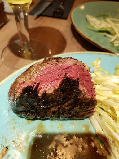 For the main course, I had the filet mignon Belgian Blue White (âŹ28.50 for 250g), and the taste of this steak was truly amazing. It was actually served quite simply with fries, but the meat itself had an incredible flavor! Really top-notch. The prices of the steaks are fairly standard! Starters are a bit more expensive and smaller in portion size.