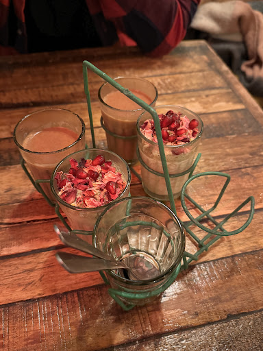 Dining at Mission Masala was an unforgettable culinary journey, marked by a symphony of flavors that danced across our palates with each bite. The menu, featuring highlights such as bbq mushroom moilee, boom ting butter, richly spiced daal, tangy tamarind soda, beets and innovative poori bombs, offered a feast that was nothing short of mind-blowing. The daal, in particular, stood out for its depth and complexity of flavors, showcasing the chef's mastery over traditional spices.