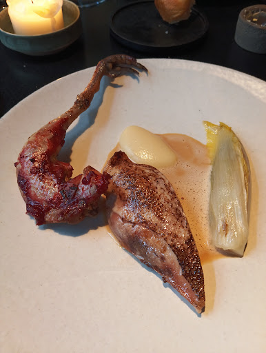 Read moreCosy place, however for the price you are paying (we paid 690 for 4 persons, apero, 6 course menu, wines and tea/coffee) the food tastes too ordinary. Everything was tasty but for this price I expect better than just tasty. The paired wines didn't really feel paired and were almost all natural wines (you love it or you hate it) which were not really special. On a positive note, their signature dish, in-house aged entrecote was exceptionally good. The dessert/cheese wines also were nice.
