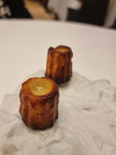 Als aperitief nemen we de alcoholvrije Oostenrijkse priseccos van Jörg Geiger. Hierbij krijgen we al wat fingerfood, gevolgd door een amuse van nori gemaakt met rammenas afgewerkt met pompoen en een heel klein toefje citroen. Een indrukwekkende start, want deze amuse is onvergelijkbaar, de jonge creativiteit spat er af en de smaak is ten top. De volgende amuse is huisgemaakte makreel, komkommer en yoghurt, Daarna nog een ganache van foie, gerookte paling en gepekelde groentjes. De laatste amuse is op basis van varkenspoot, gepofte boekweit en beurre noisette. Alle amuses samen zijn een symfonie van smaken. Op tafel komt ook zuurdesembrood van een lokale bakker, exclusief gemaakt voor het restaurant. Als eerste voorgerecht is er de Noordzeekrab in twee bereidingen namelijk onderaan puur en een tempura softshell, dit met kaffir, verse venkel, verse groene appel en sorbet van groene appel. Een voorgerechtje met contrasten: koud, warm, smeuïg en krokant. De full house smaaksensatie. Hierbij serveert Evelien een alcoholvrije Belgische Wakataya, zonder additieven van botan-distillery.com Tweede voorgerecht is de zeeduivel of lotte met peterseliewortel, butternut pompoen, beurre rouge. Hierbij een alcoholvrije van een Duitse wijnbouwer. Groene jachtpeer, houtrijping! We komen aan het extra gerecht. Het extra gerechtje is altijd iets luxueus, bijvoorbeeld met truffel, of kaviaar, of hoppescheuten… Vandaag is het wintertruffel. Ravioli van ossenstaart, Parijse champignon, kalfsjus. De geur van de wintertruffel is een ware genieterssensatie. De alcoholvrije hierbij is alweer Belgisch! De basis is ananasap gefermenteerd met hibiscus en kruiden.