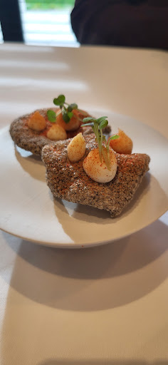 Chef Joris heeft een fantastisch 4-gangenmenu voor ons samengesteld, dat niet alleen heerlijk was, maar ook vol verrassingen zat. We werden vermaakt met smakelijke amuses en het warme broodje, een specialiteit van het huis, was absoluut onweerstaanbaar,. Elk bordje is een klein schilderij en de smaken zijn perfect op elkaar afgestemd. Bij de koffie zijn er ook lekkere versnaperingen.