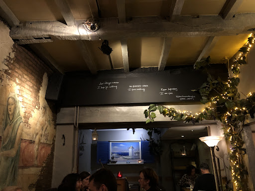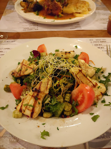 Dan komt het eten en laat me zeggen dat het echt niet goed was . De mezze was echt heel triest , triestige porties en uitzicht en geen scampi of inktvis te bespeuren zoals in een ander Grieks restaurant. Daar wordt dan goedkoop wit half droog stokbrood bij geserveerd. De kipfilet gevuld met spinazie en feta (zo vermeld zonder meer op het menu) wordt al even triestig geserveerd. Het komt in een plas van warme honing mosterdsaus (!!) waar de sla dan ook in drijft km van de aardappelen en groenten nog te zwijgen. Ik vroeg om een ander bord om het eten over te scheppen zonder saus en zo het nog te kunnen eten en zelfs dat was teveel. De bazin staat er dan steeds op te kijken maar zegt niks tegen de klanten. Sigaretje roken op het terras naast de klanten wel.