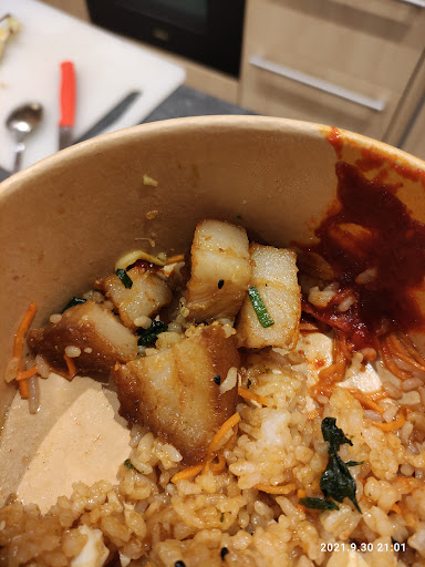 Unfortunately though, the bibimbap has some awful sweet sauce on it and has pork fat in it. Not meat.