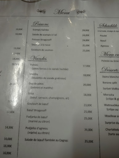 Read moreUne très belle découverte, c'est le seul restaurant Russe en partie francophone. Le patron est belge et la patronne est russe c'est elle qui est aux fourneaux. L'accueil par le patron est tout simplement génial. Il sait mettre les gens à l'aise, il explique les plats et il est à l'écoute des clients ainsi que son personnel qui est également très bien. Cette cuisine Roborative et généreuse est servie dans un cadre chaleureux et rassurant, pas trop cliché où la fête n'est jamais loin. Au niveau des plats nous avons pris un bouillon typiquement russe le Borschi aux betteraves et légumes avec ail, les scampis kalinka excellent, le pelmenisorte de ravioli farci au bœuf ou au poulet également très bon, la goulasch de bœuf rien à voir avec la hongroise très bonne et l'incontournable stroganoff de bœuf vraiment excellent et en dessert la Charlotteka tarte aux pommes cannelle et glace. Ne quitter pas le restaurant sans la traditionnelle séance de la vodka et du verre cassé qui se fait en sécurité dans une partie du restaurant. Si vous passez par Arlon allez franchement découvrir ce super restaurant. Il vaut mieux effectuer une réservation même si c'est sur deux étages il...