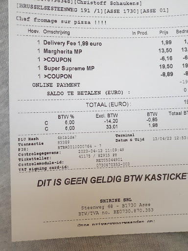 Read moreabsoluut schandalig! voor de god weet hoeveelste keer hebben ze weer pizza verkeerd meegegeven aan klanten en hebben ze de hele bestelling opnieuw moeten maken. wat is het punt zelf van online te kunnen bestellen en een uur te krijge om af te halen als je bij het ter plaatse komen zelf nog moet wachten tot ze aan je pizza begonnen zijn. alsook, in veel kleinere winkels slagen ze er in om een Covid wachtrij te maken binnen in de winkel, in deze winkel waar binnen meer van voldoende plaats is om een wachtrij te maken met respect voor de afstandsregel vragen ze aan de mensen om buiten te wachten op de steenweg waar continu auto's voorijkomen in de kou en de regen. ik herhaal:...