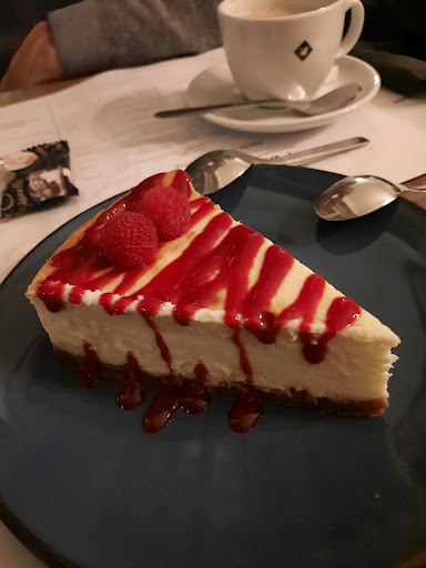 Als afsluiter een stukje kaastaart met speculaas en frambozen couli. Lekker, licht, zeer smaakvol.