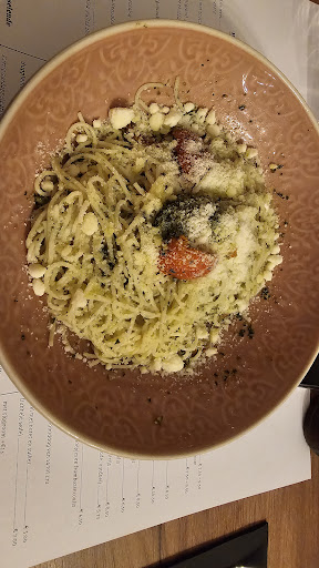 Aangenaam kader Geen uitgebreide kaart maar net dat vind ik een sterkte. Er is echt voor ieders wil. Vegetarisch kan ook. Net zoals glutenvrij brood en pasta ook aangeboden worden. Dit is echt een meerwaarde. Ook staan er alcohol vrije aperitief opties op de kaart.