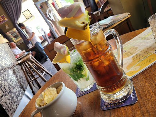Un café situé au coin de le dendre qui surprend quand on y rentre.Le mobilier empreint de mélange d éléments et de vaisselle ancienne de nos grands mères voire plus loin dans les générations.. S,asseoir dans un ancien sofa ou s attabler autour d une ancienne machine à coudre,génial !Sans oublier un service d exception avec des,cocktails ou un picon jamais aussi bien servi ailleurs et un prix...tant à dire quoi!continuez ainsi...