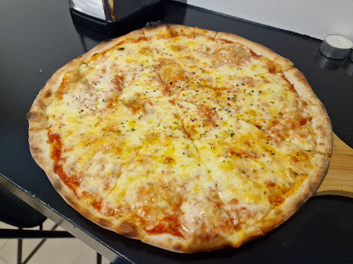 Pizza Margherita ervaring #77 De pizza werd bereid in een elektrische steenoven, al waren er opvallend genoeg grillstrepen zichtbaar aan de onderzijde. Het deeg was smaakvol, maar aan de onderkant iets te licht gebakken door de grill. Wat te rijkelijk belegd met kaas, wel uitstekend gesmolten zonder harde korstvorming. De tomatensaus was moeilijk te onderscheiden, maar leek vers en zonder gebruik van concentraat. De toegevoegde olie had een aangename smaak, al kwam deze tegen het einde wat zwaar over, ook had ik liever een vers blaadje basilicum gezien in plaats van de oregano. Al met al een smakelijke kwalitatieve pizza met een prima prijs-kwaliteitverhouding. De uitbaters waren bijzonder vriendelijk. Binnen zijn 5-tal plaatsen om te eten aan...