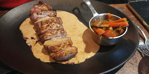 Read morePetite visite dans ce restaurant qu'ont m'avais recommander et ou mon premier passage ne m'avais pas enchanté mais j'aime bien retourner à un autre moment où c'est plus calme résultat c'est pas mieux qu'avant alors qu'il n'y avait qu'une dizaine de couvert J'ai pris des coquilles St Jacques en etuvee de poireaux (voir les photos) j'ai cru que c'etais un potage tellement les coquille ''baignait '' dans la sauce c'est dommage cau la cuisson étais top!! En plat principal un pavé Orgeo Cuisson correct mais viande trop dure a 27€ le morceau c'est bien cher payé et je parle pas de la présentation du plat! En dessert fraise sorbet violette très bien C'etais pour moi le meilleurs plat sauf que le dessert de mon fils crème brûlée flambée a été servie un bon 1/4 d'heure avant mon plat!! Deux 1/2 bouteilles de vin un rouge et un blanc de bonne qualité mais a ce servir soi même!! Jamais un serveur pour remplir les verres ( ils préférait rigoler a trois derrière le comptoir !!) J'oublie mon assiette ébréché !! Bref a 155€ je suis franchement déçu du repas et du service cela ne vaut vraiment pas l'argent dépensé Pour moins chez allez a Falmigoul chez CCnomie service et...