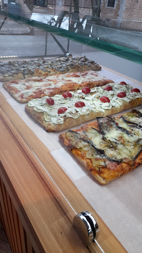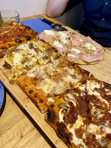 Nous avons pris des pizza al taglio (à la découpe) ⭐️⭐️⭐️Amatriciana ⭐️⭐️Mozzarella, saucisses italiennes, pommes de terre, romarin ⭐️Sauce tomate jaune, mozzarella,nduja, burrata, oignons caramélisés ⭐️⭐️⭐️⭐️MARINELLA (de Gabriele Bonci ) une Marinara remplie de mortadella