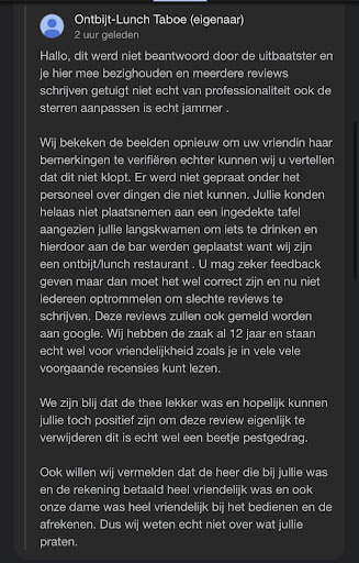 Read moreHet eten is zeer lekker en ook het glutenvrije aanbod smaakt. Ik ben er als coeliakiepatiÍnt nog nooit ziek geweest. Helaas is er geen glutenvrije kaart. Dit maakt het moeilijk om te bestellen. Na elke keer 2 glutenvrije pistolets te krijgen kreeg ik er de laatste keer ineens maar 1⌠Glv pistolets zijn veel kleiner dan een gewone pistolets en dit was te weinig als lunch. Toen er werd gevraagd of alles in orde was heb ik daar een opmerking over gemaakt. Uiteraard was het mijn schuld dat ik zonder glv kaart had moeten weten dat de lunch 1 pistolets is en het ontbijt 2 pistolets. Naast het mooie interieur en het lekkere eten vind je er dus ook een uitbaatster met de langste tenen van West-Vlaanderen. Iedere aanmerking of vraag wordt door haar als een persoonlijke aanval opgenomen. Zoals hier eerder werd vermeld door een andere klant neem je best een tafeltje buiten, tenzij je graag luistert naar het onprofessionele geroddel over voorgaande klanten of klanten die boven zitten. Als buitenlander mag je er gewoon naast blijven staan terwijl ze je zwart maakt. Als je telefonisch reserveert, zeer duidelijk de dag/datum zeggen want anders staat dit op de verkeerde dag ingeboekt en ook dit kan enkel de klant zijn schuld zijn. Reserveer je online, dan kan je worden verward met een andere klant. Wijs je hen daarop, dan krijg je meteen een aanvallende mail terug. Ook als je vermeldt dat je dus glv moet eten is het normaal dat het glv gebak (die overigens zeer lekker is en waar ze reclame mee maken) 4 dagen (incl. weekend) voor sluit uitgeput is. Dit vermelden in het mailverkeer is niet nodig, ik moest maar de enigste glv optie eten⌠Het concept kiezen op restaurant is voor een coeliakiepatiÍnt blijkbaar taboe bij Taboe. Eten wat de pot schaft, betalen en zwijgen. Vandaag was de allerlaatste keer dat ik bij jullie heb gegeten en voor 1 keer ben ik zeker dat we hierover op dezelfde golflengte zullen zitten. Uiteraard verwacht ik naar goede gewoonte een aanvallend weerwoord, die ik niet zal lezen, hierop...