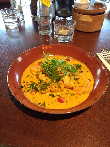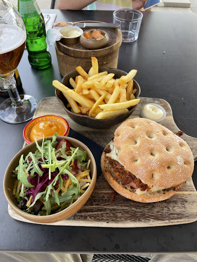 Read moreVooraf wat zoeken waar we ons binnen moesten aanmelden, dan gingen voor wat sharing als voorgerecht met de calamares (prima) en de bruschetta (kan je niet veel mee fout doen, maar ze waren top!), hoofdgerechten scampi-spies en steak met jagersaus, (beiden suggesties), ook zeker ok, ondertussen hadden we de maître (prima service) zelf een voorstel laten doen qua wijn, een goede (jonge 2021) chardonnay van Jean Fery), deze bleek achteraf eigenlijk te veel te kosten in verhouding (80 €/fles), voor een brasserie stijl met slechte akoestiek, eigenlijk veel te veel (we hadden de prijs ook niet gevraagd, het is hier geen speciale wijnbar !?, te uitgebreide wijnkaart ?!), als dessert van de avond, ....kwam er geen meer (22.14 hr), "de keuken is helaas al dicht", terwijl ik net de dessertkaart had gevraagd, en gekregen en dan wilde bestellen, het is het een of het ander, "kan niet meer of je verzint maar wat", allemaal niet zo moeilijk (nam overigens de dessert suggestie) ... Toiletten netjes, wel even naar het "mannetje" moeten zoeken. Dus kortom, service en eten allemaal ok, wijn goed te bekijken !, maar toch, en het refter-idee en geluid moet er uit. In de zomer zal het buiten zeker ok zijn, maar dat is het dus...