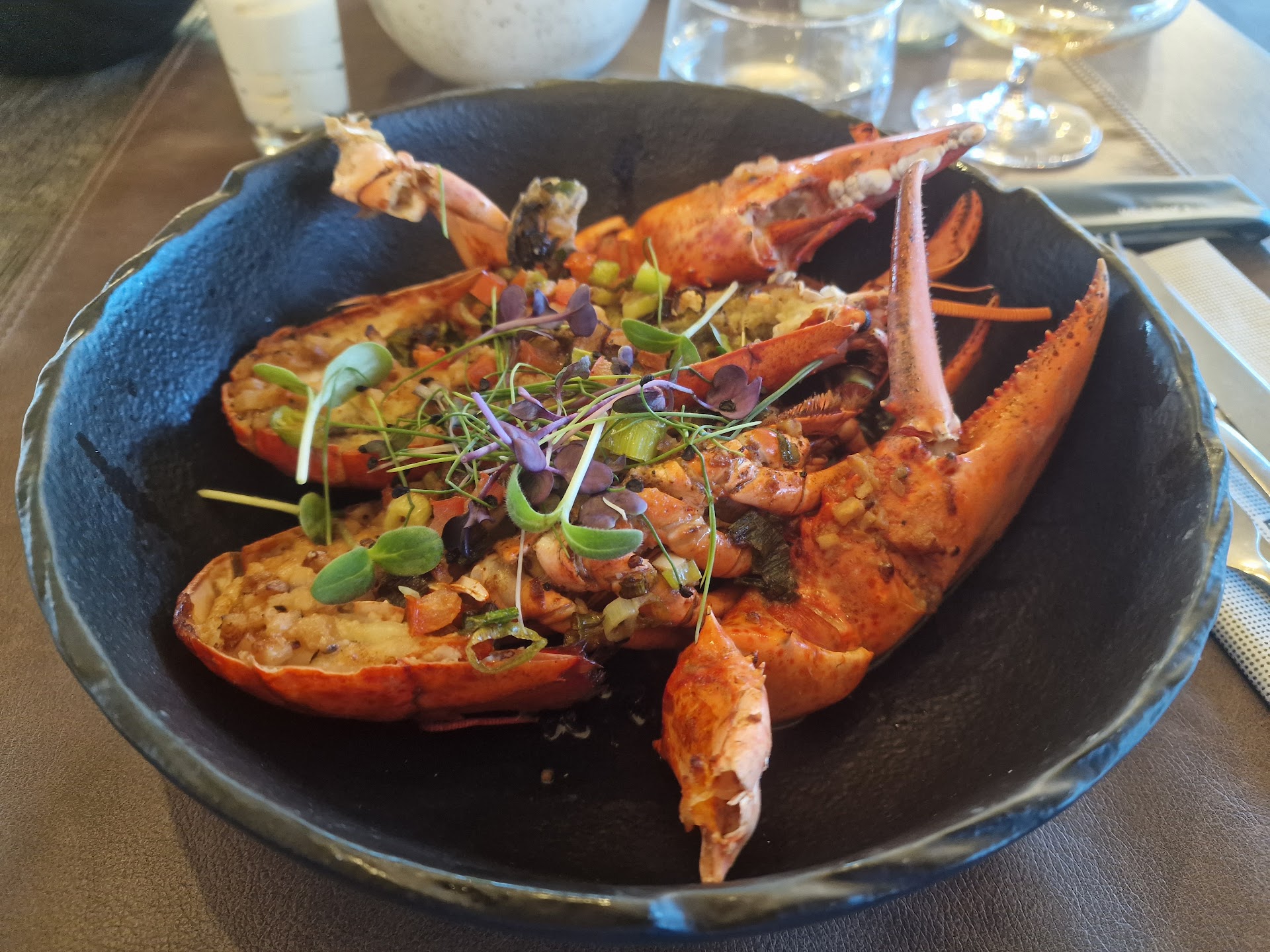Kreeft met lookboter: Deze viel tegen, weinig kreeftvlees, de schaal was nog niet voorgebroken, het was te fel gekruid waardoor je je soms verslikte.